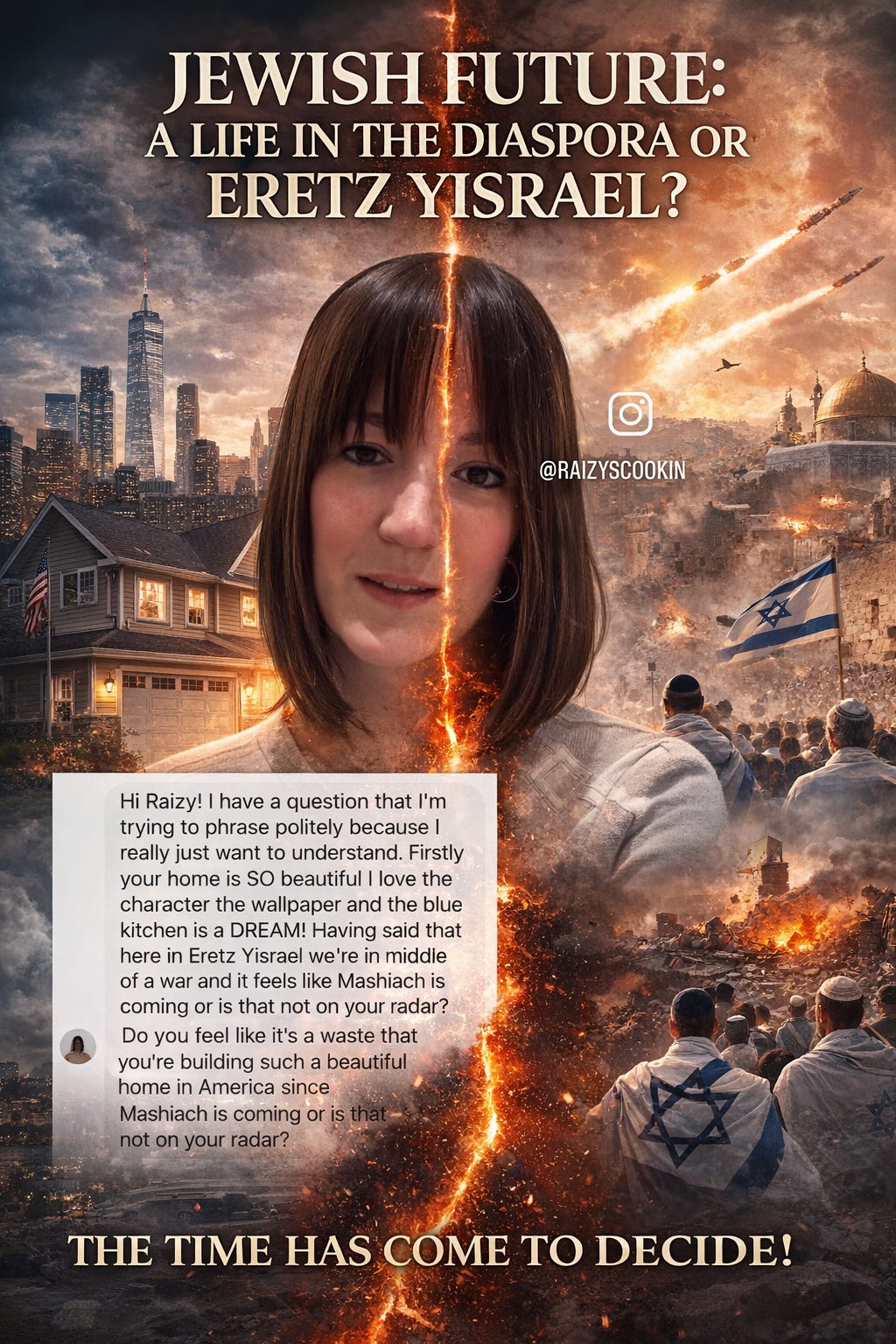 In a recent comment, influencer Raizy Fried — known on Instagram as @raizyscookin — addressed a question about whether it makes sense to continue building a beautiful new home in America at a time when many Jews in Israel feel that history is accelerating toward redemption. Her response, which can be seen here: