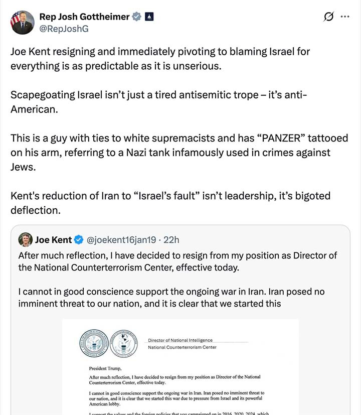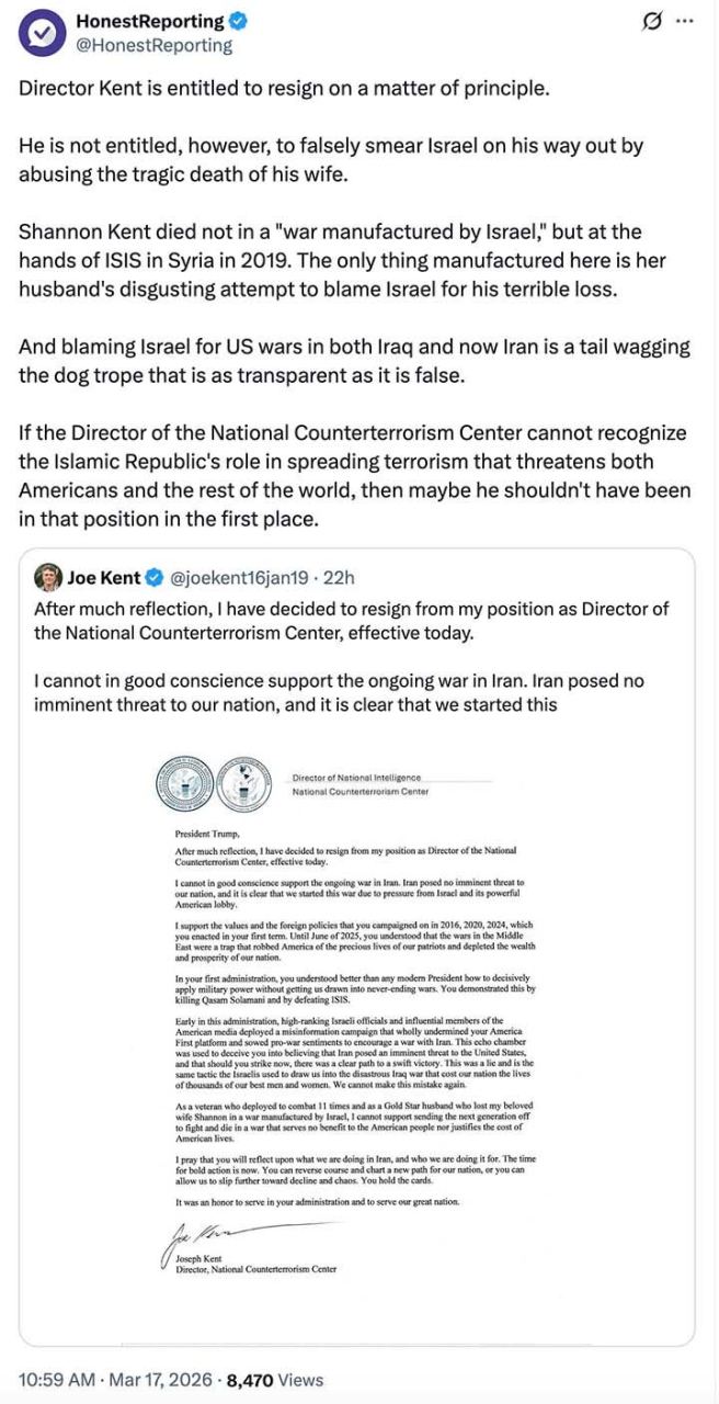 (Honest Reporting) — Within hours of publishing his resignation letter on X, Joe Kent, the Director of the National Counterterrorism Center, had reached millions.