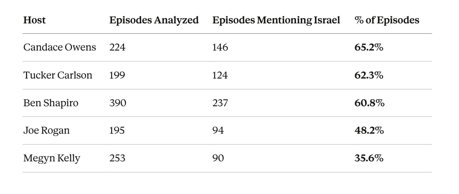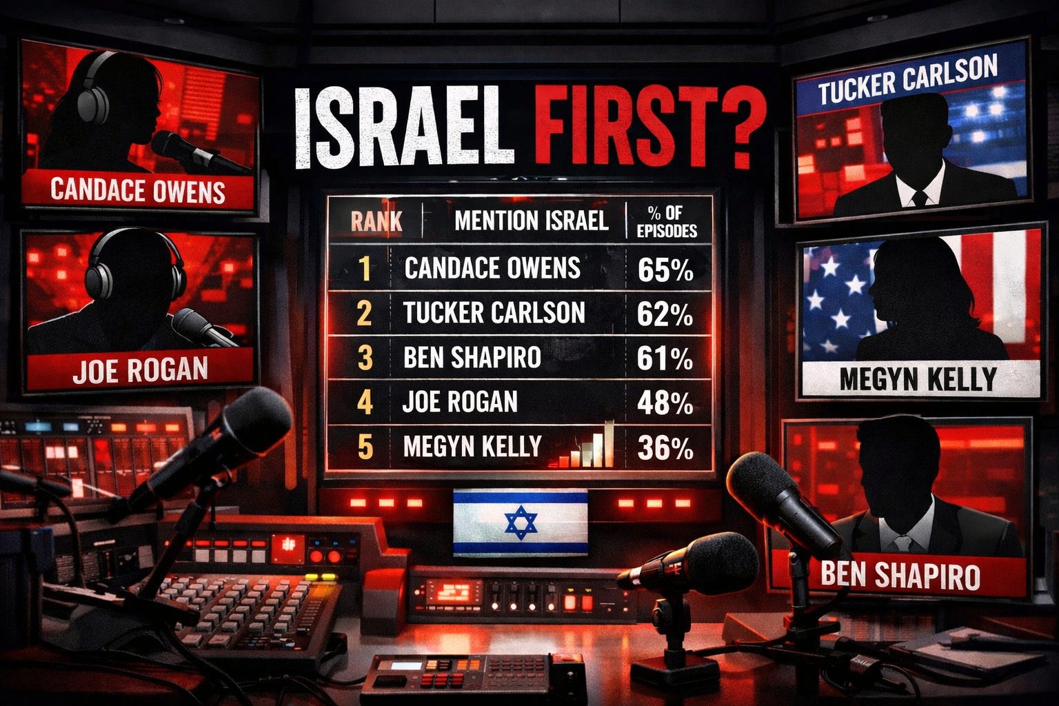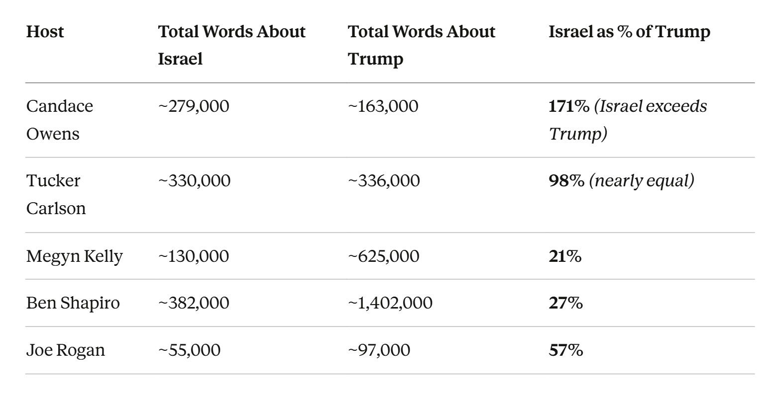 Using Claude AI, I analyzed the full transcripts of five major conservative-adjacent podcasts from January 2025 through March 2026: Ben Shapiro, Tucker Carlson, Candace Owens, Joe Rogan, and Megyn Kelly. I tracked how frequently each show discusses Israel, how many words are devoted to it, and where it ranks among all topics covered. The results challenge the conventional narrative.