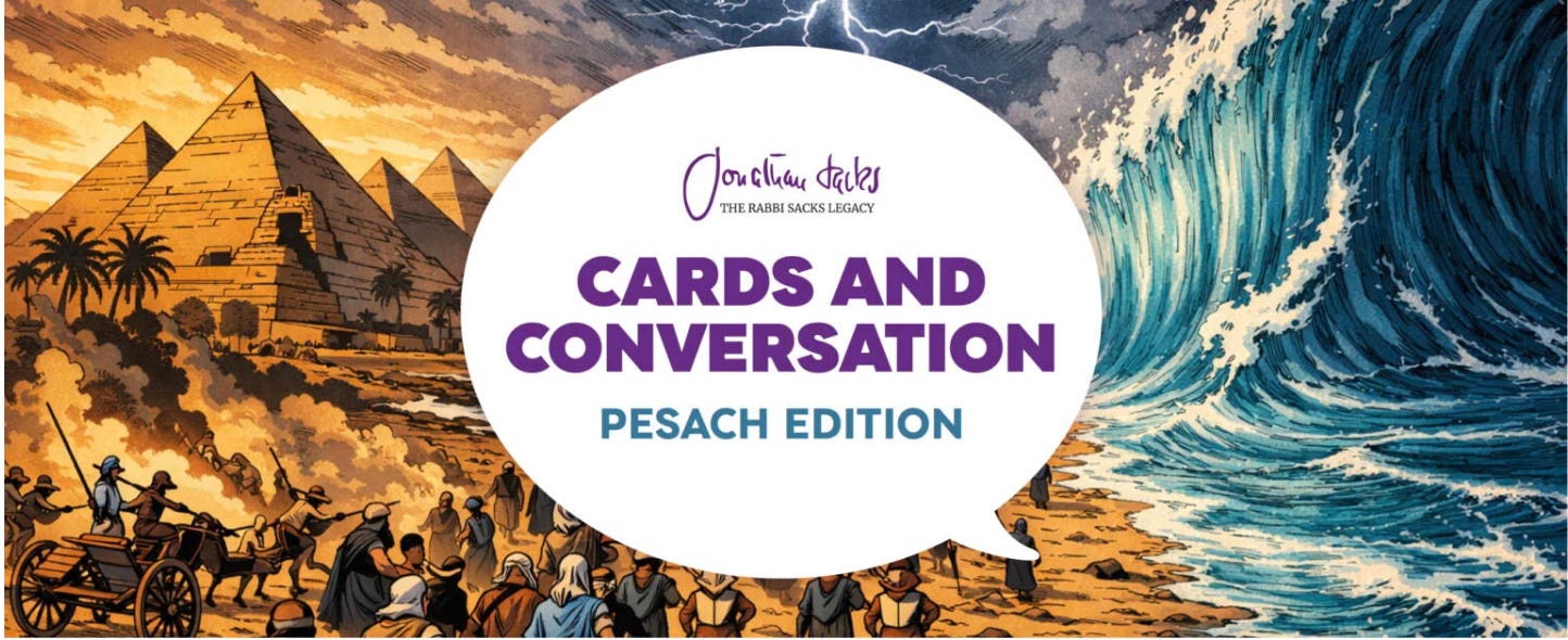 I’ve also loved seeing the new (and freely available) cards for family discussions at the Seder, based on R’ Sacks’ teachings and produced by the Sacks Legacy Fund. They’re called Cards & Conversation and are a really nice way to make the Seder more interactive and meaningful. Definitely worth checking out.