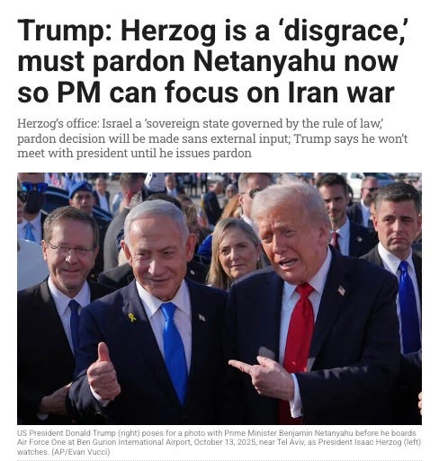 There was too much going on with the war for the shock at Donald Trump’s utterly outrageous demand that President Isaac Herzog pardon PM Netanyahu “today” to get the attention that it deserved. Donald Trump calling Isaac Herzog “a disgrace” was beyond disgusting. It was vintage Trump; obviously, he likely raised the issue because Netanyahu asked him to, directly or indirectly, but still, it was appalling.