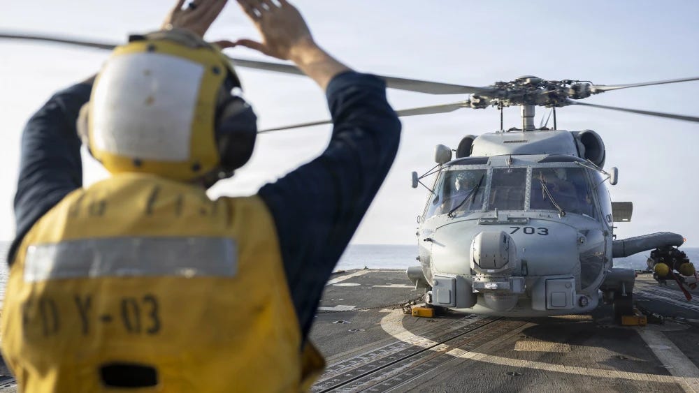 A U.S. sailor, assigned to Arleigh Burke-class guided-missile destroyer USS Delbert D. Black (DDG 119), directs an MH-60R Sea Hawk helicopter, attached to Helicopter Maritime Strike Squadron (HSM) 46, during a flight quarter evolution during “Operation Epic Fury,” March 17, 2026. Credit: U.S. Navy.